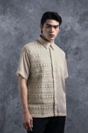 Kemeja ini dirancang dengan potongan Reguler Formal yang memberikan siluet rapi dan profesional. Kemeja ini memberikan sisi tegas melalui desain Asimetris yang dilapisi Brokat dengan sentuhan modern yang unik. Penggunaan Hidden Button memastikan tampilan depan menjadi clean dan minimalis, sementara detail Saku Bobok di dada kiri dan Lengan Pendek memperkuat karakter eksklusifnya. Kemeja ini sangat cocok untuk acara formal, perhelatan mewah, maupun momen spesial penting lainnya.