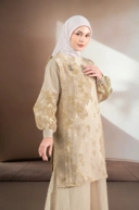 Kombinasi lengan organza printed menciptakan tampilan yang airy dan elegan.