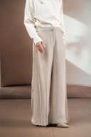 Desain palazzo dengan detail pleats membuat celana ini cocok untuk tampilan formal maupun smart casual, mudah dipadukan dengan berbagai atasan.